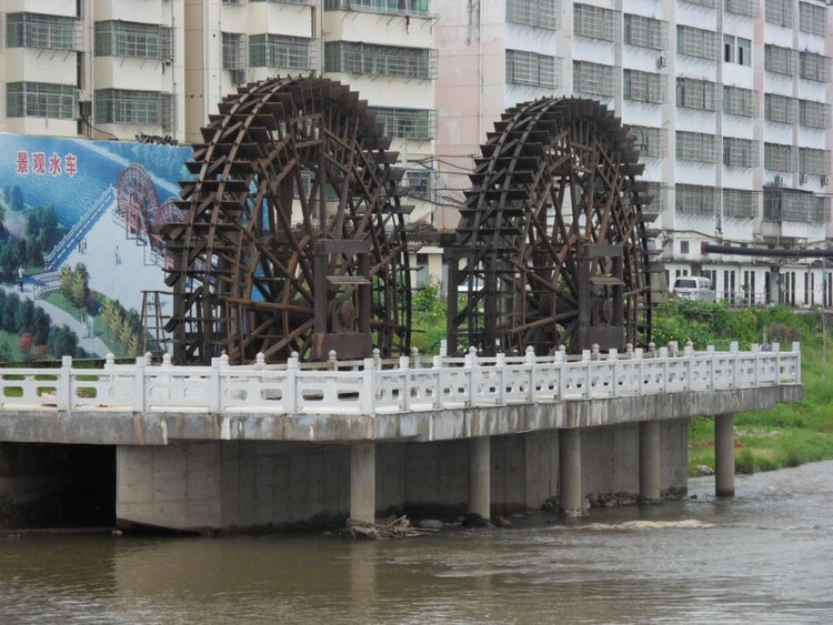 水車外形酷似古式車輪。輪幅直徑大的20米左右,小的也在10米以上,可提水高達(dá)15-18米。輪幅中心是合抱粗的輪軸,以及比木斗多一倍的橫板。一般大水車可灌溉農(nóng)田六、七百畝,小的也可灌溉一、二百畝。水車省工、省力、省資金,在古代可以算是的灌溉工具了。